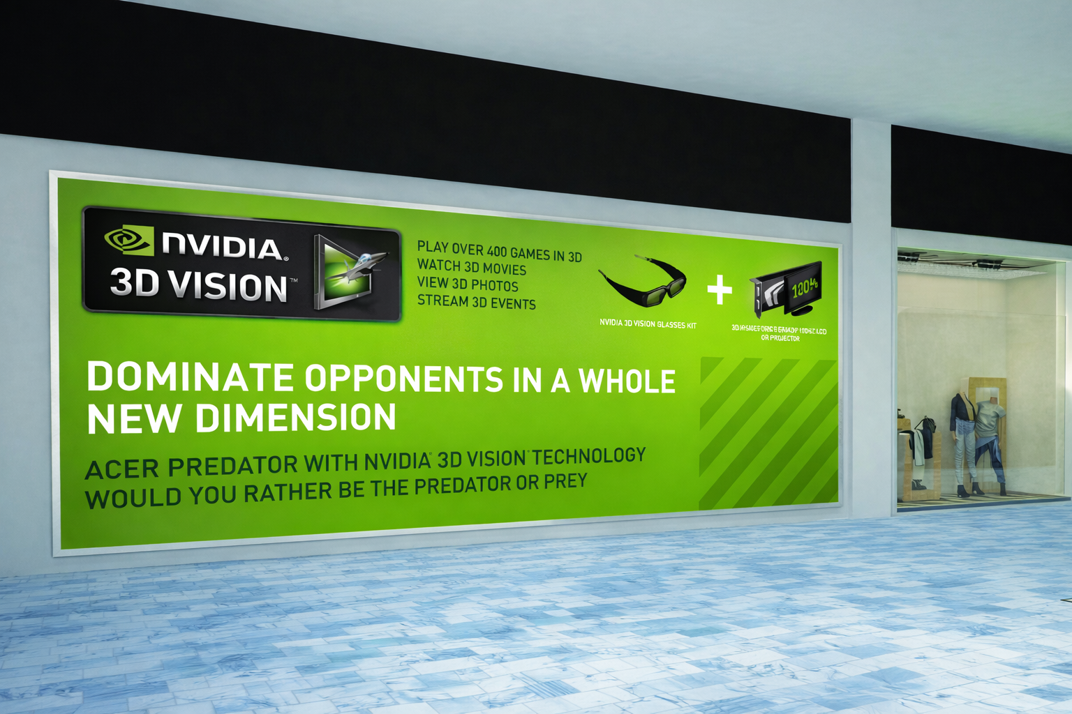 HueyDesigns evolved NVIDIA’s NSIST platform into a retail-first growth engine to drive awareness, hands-on adoption, and conversion of NVIDIA 3D Vision glasses by translating GPU power into four experiential pillars—Insane Performance, Intense Gaming, Immersive Videos, and Incredible Photos.
